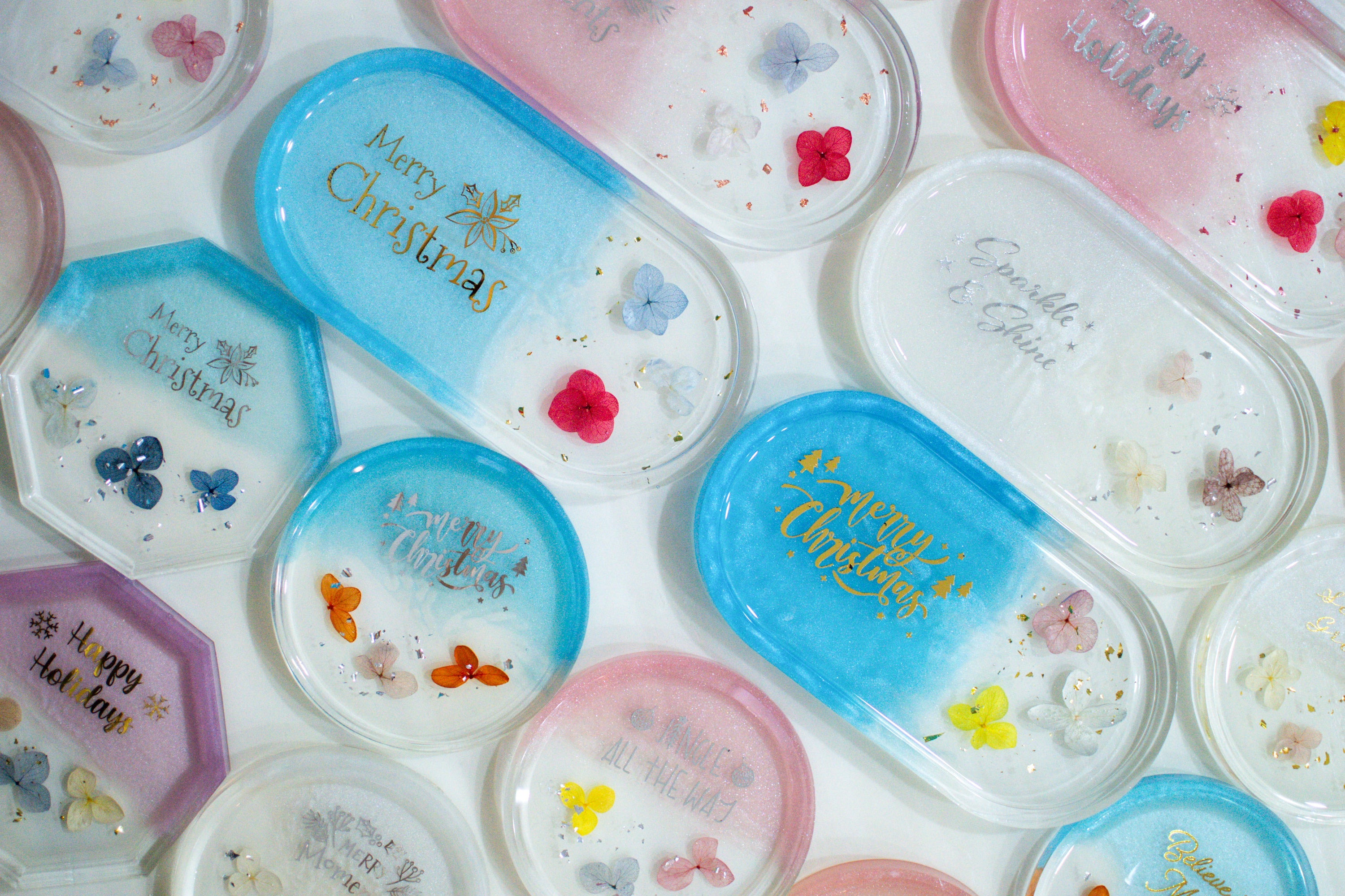 Try your hand at it. With more than 30 features to personalise the colour, floral designs, themes, and text of our hand-made resin gifts, we promise that you would be spoilt for choice.