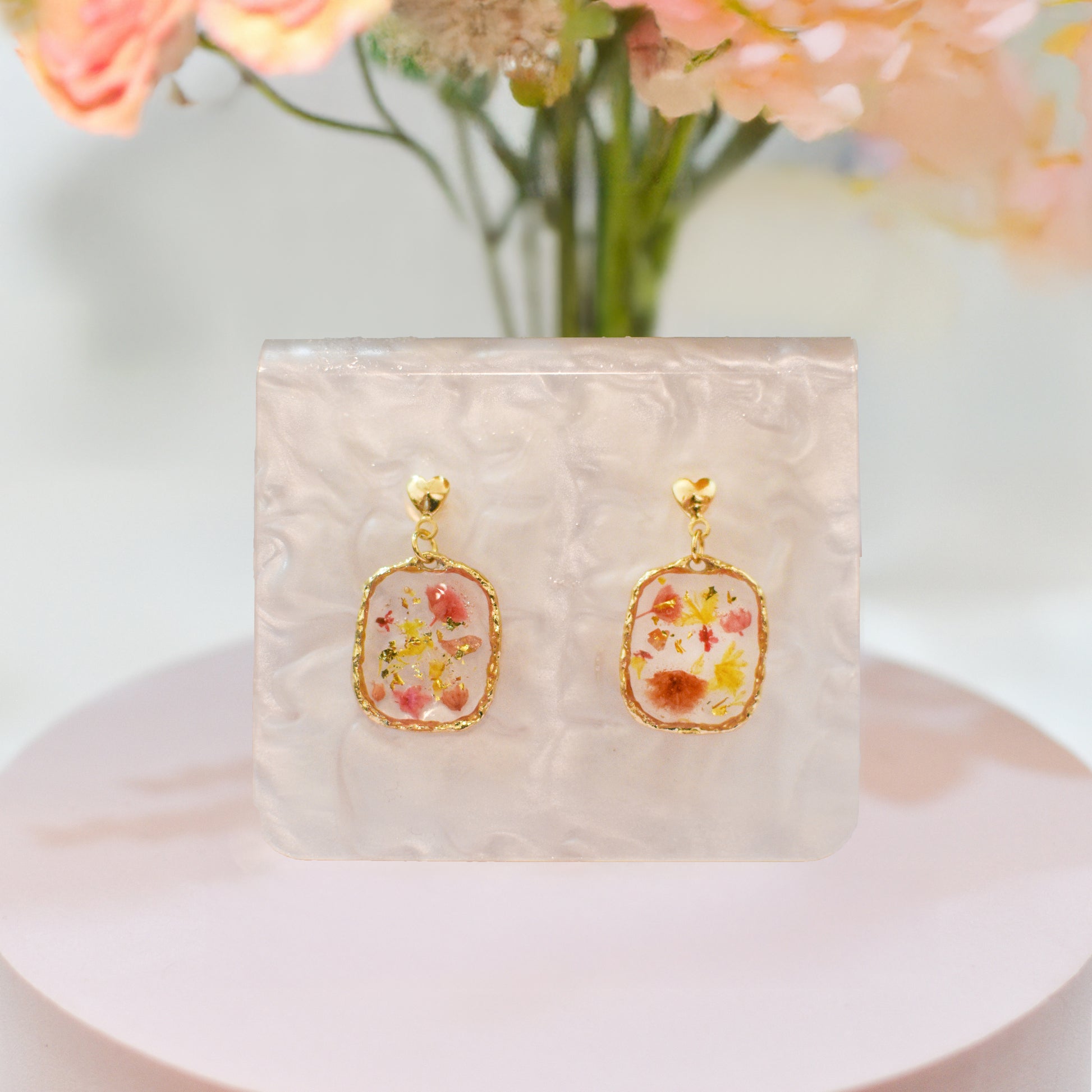 A delicate blend of pink, yellow and white florals, thoughtfully arranged and preserved in crystal-clear resin, with gold flakes that catch the light just right. These earrings are designed to be soft yet striking — a quiet statement for everyday or special occasions.